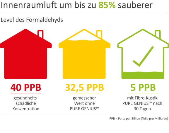 De Pure Genius® luchtreinigende coating van Fibrolith® onttrekt schadelijke gassen (zoals Formaldehyde) uit de omgevingslucht onder invloed van zon- of kunstlicht.